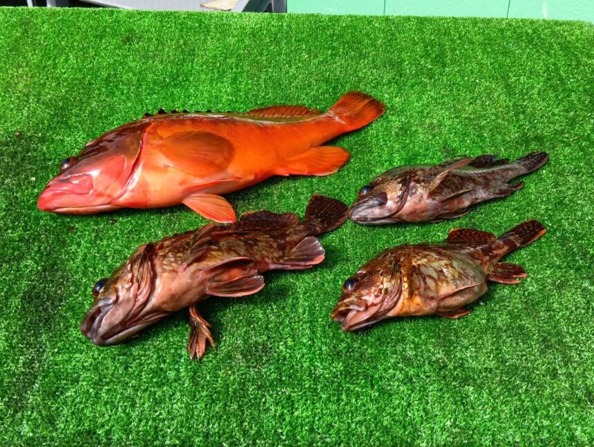 船外機ボートで奥山さんがアカハタ、カサゴをゲット。