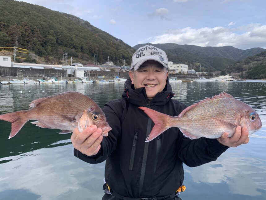 船外機ボートで山田さんがマダイ、タカノハをゲット。