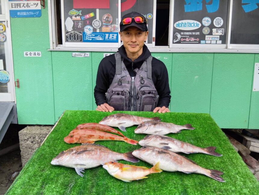 船外機ボートで中野さんがマダイ、グレ、オオモンハタをゲット。