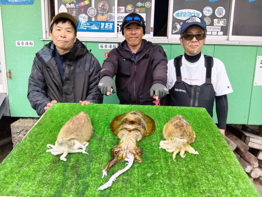 船外機ボートで吉田さんがアオリイカ、カミナリイカをゲット。