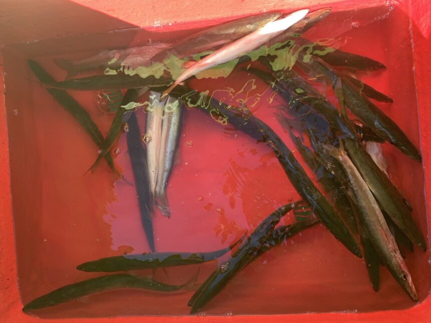 船外機ボートで長嶋さんがグレ、タカノハ、カサゴをゲット。