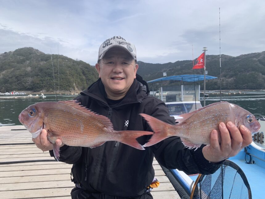 船外機ボートで北方さんがイシダイ66㎝、マダイをゲット。