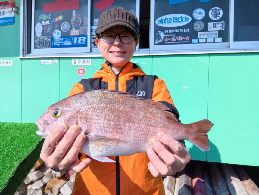 船外機ボートで田之上さんがマダイをゲット。