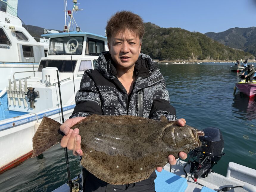 船外機ボートで真木さんがヒラメをゲット。