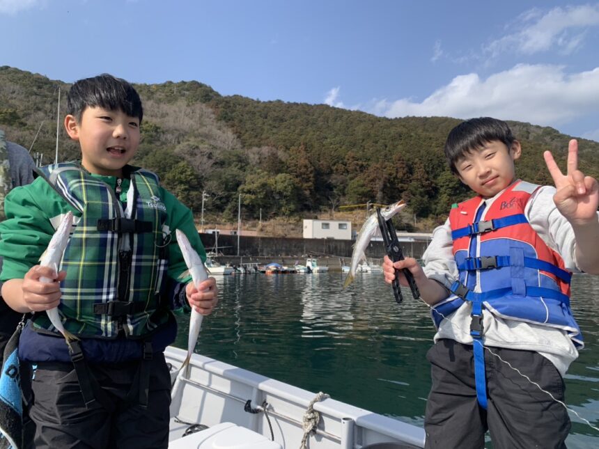 手漕ぎボートでともちゃんがアジ、カマス、イワシをゲット。