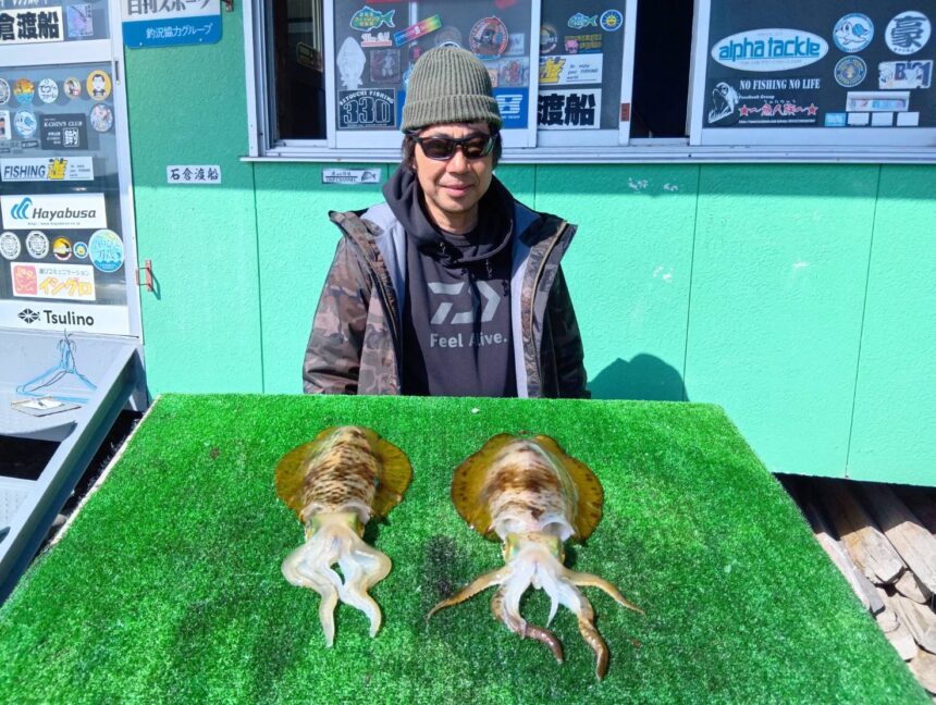 船外機ボートで飯田さんがアオリイカ1.24キロまでゲット。