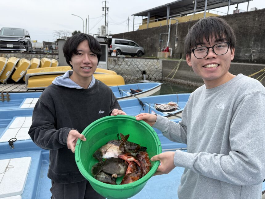 船外機ボートでヨシキさんがカワハギ、カサゴをゲット。