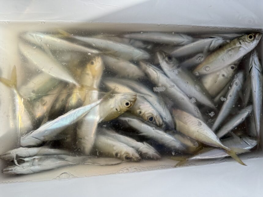 手漕ぎボートで岡崎さんがアオリイカ、アジをゲット。