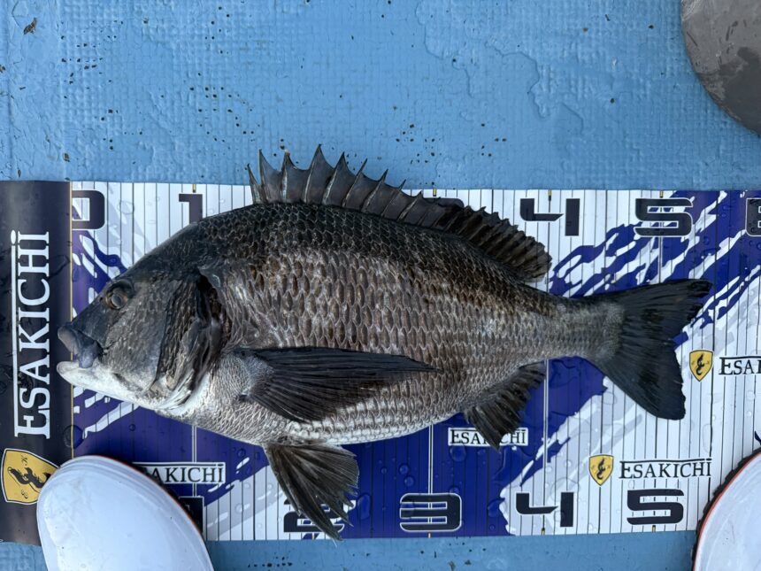 カセ釣りで田中さんがチヌ43㎝をゲット。
