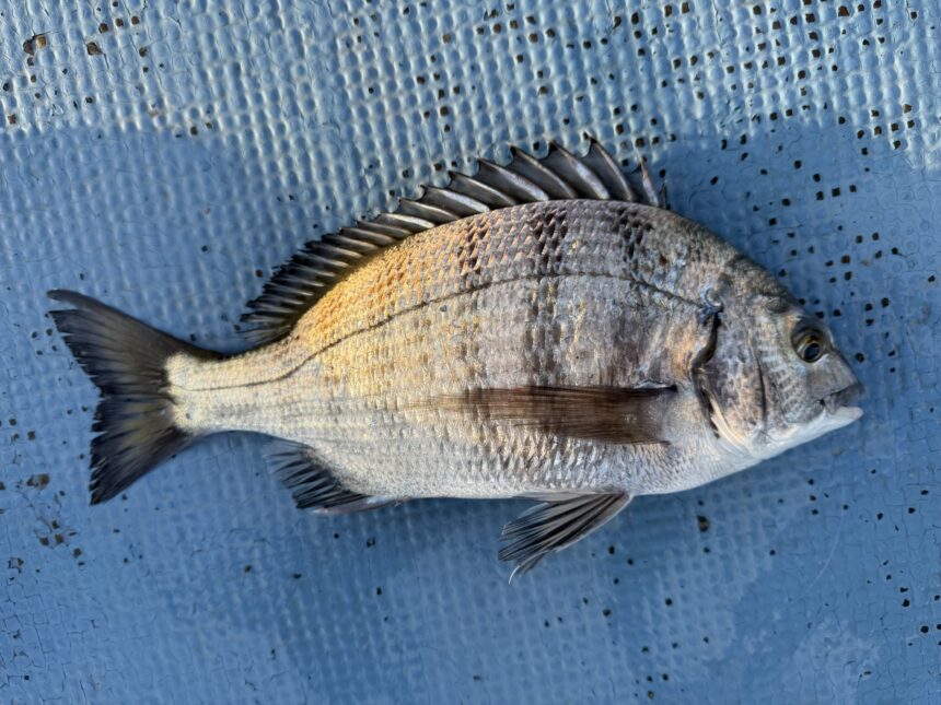 カセ釣りで藤本さんがチヌ30㎝をゲット。