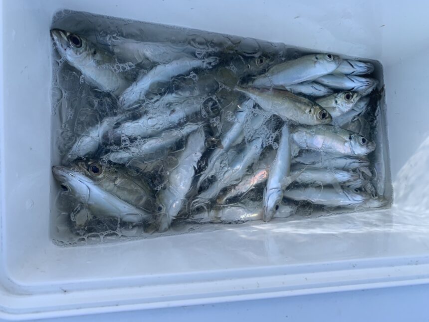 手漕ぎボートで鈴木さんがカマスをゲット。