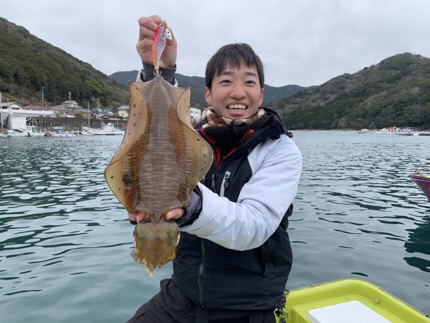 船外機ボートで岡崎さんがアオリイカ1.04キロをゲット。