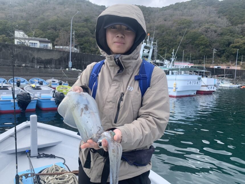 船外機ボートで近江さんがアオリイカをゲット。
