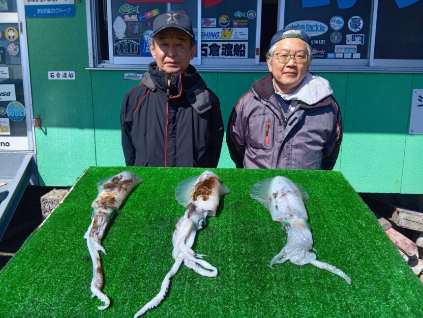 船外機ボートで森本さんがアオリイカ1.3キロをゲット。
