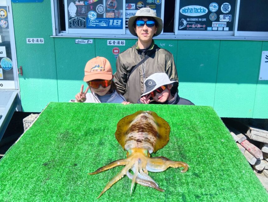 船外機ボートで森本さんがアオリイカ1.3キロをゲット。
