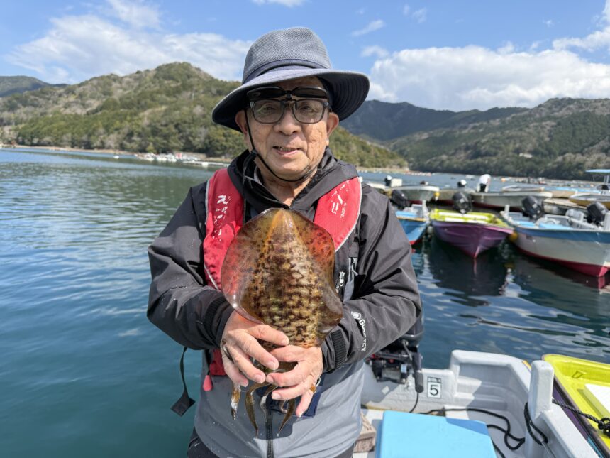 船外機ボートで青木さんがアオリイカをゲット。