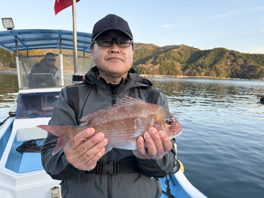 カセ釣りです下堂薗さんがマダイをゲット。
