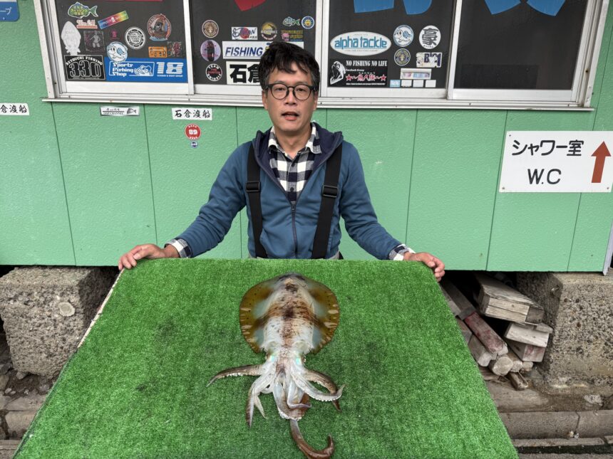 カセ釣りで森本さんがアオリイカ1.64キロをゲット。
