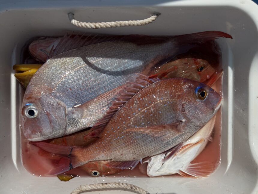 船外機ボートで増田さんがマダイ、ホウボウをゲット。