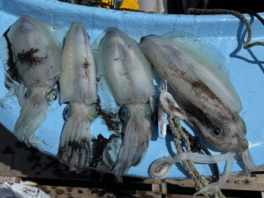 手漕ぎボートで神田さんがアオリイカ1.2キロまでゲット。