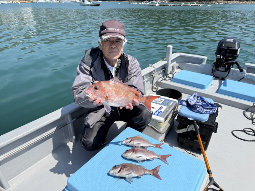 船外機ボートで田中さんがマダイをゲット。