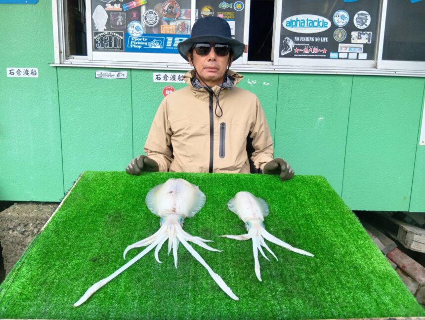 船外機ボートで喜多川さんがアオリイカ&スミイカをゲット。