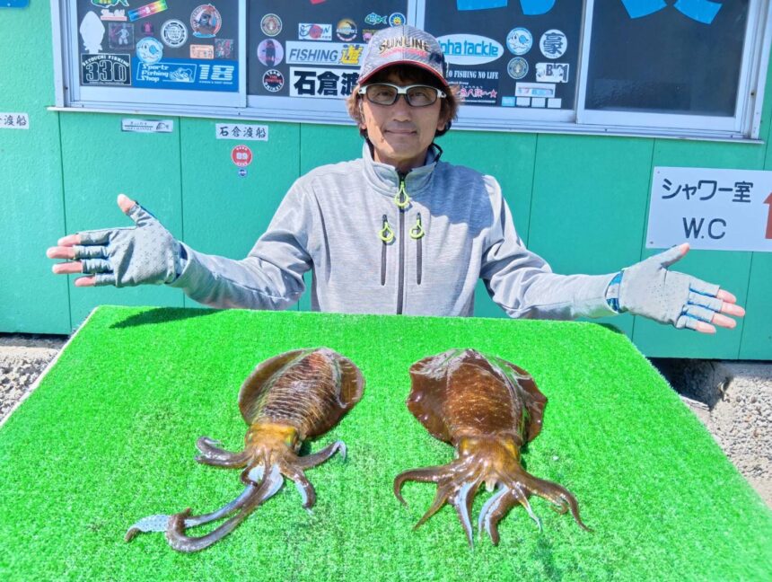 手漕ぎボートで浜島さんがアオリイカをゲット。