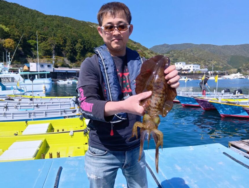 手漕ぎボートで浜島さんがアオリイカをゲット。