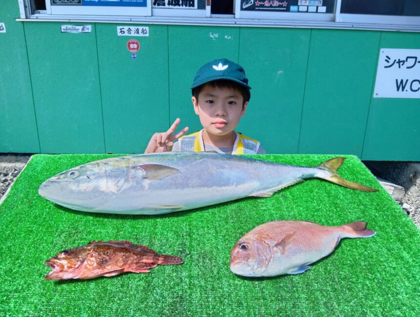 船外機ボートでゆうご君がワラサ、マダイ、カサゴをゲット。