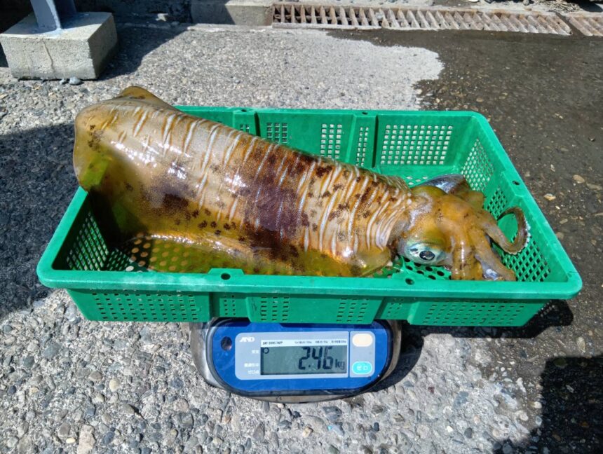手漕ぎボートで平田さんがアオリイカ1.14キロをゲット。