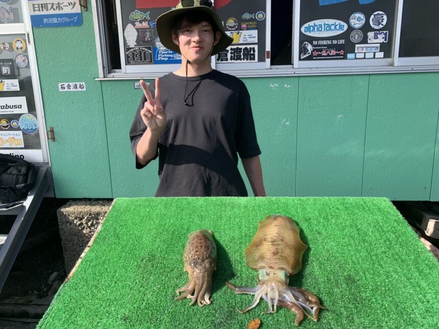 カセ釣りで村地さんがアオリイカ、スミイカをゲット。