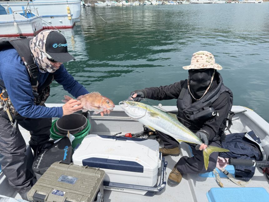 船外機ボートで馬場さんがワラサ、マダイをゲット。