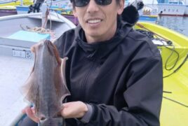 船外機ボートで岡崎さんがマダイ、キビレ、アオリイカ、スミイカをゲット。