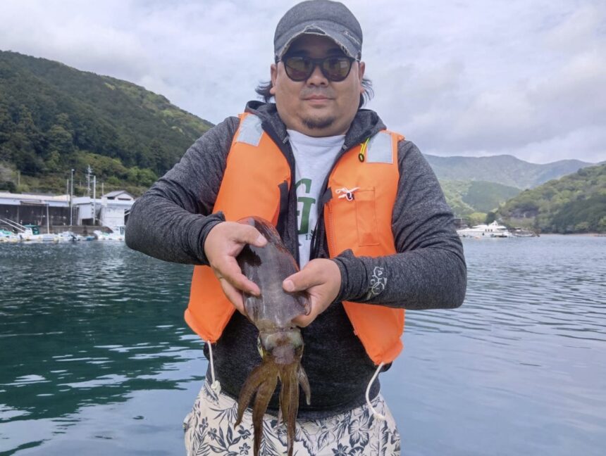 船外機ボートで鈴木さんがアオリイカをゲット。