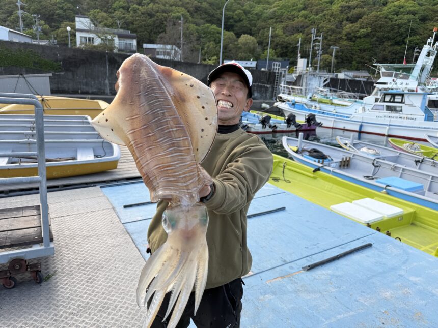 カセ釣りで小澤さんがアオリイカ1.34キロまでゲット。