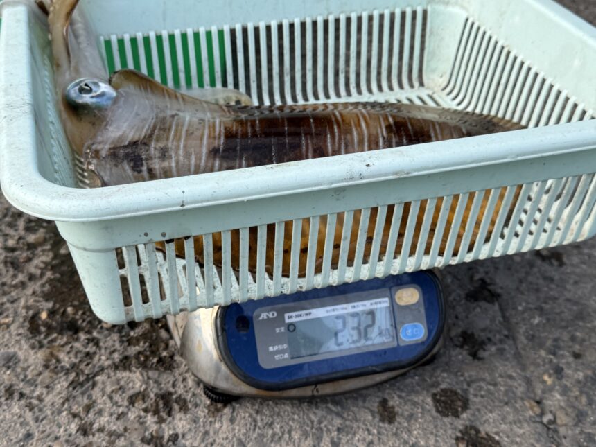 カセ釣りではしんちゃんがアオリイカ2.32キロをゲット。