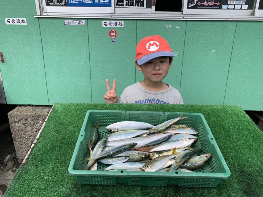 手漕ぎボートでそうま君がアジ、カタボシイワシをゲット。