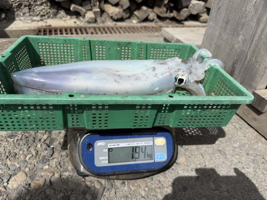 船外機ボートで龍さんがアオリイカ1.94キロをゲット。