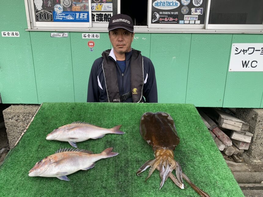 カセ釣りで加藤さんがマダイ、アオリイカをゲット。