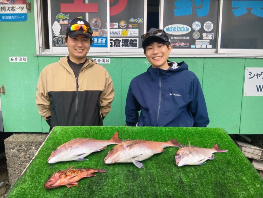 船外機ボートで小寺さんがマダイ81㎝、アカハタ、カサゴをゲット。