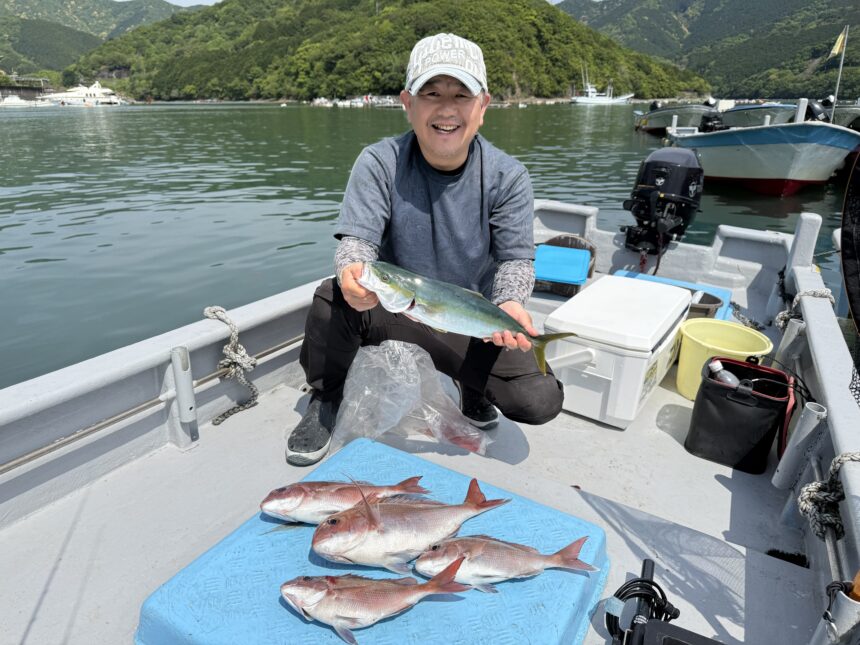 船外機ボートで川上さんがマダイ、ツバスをゲット。