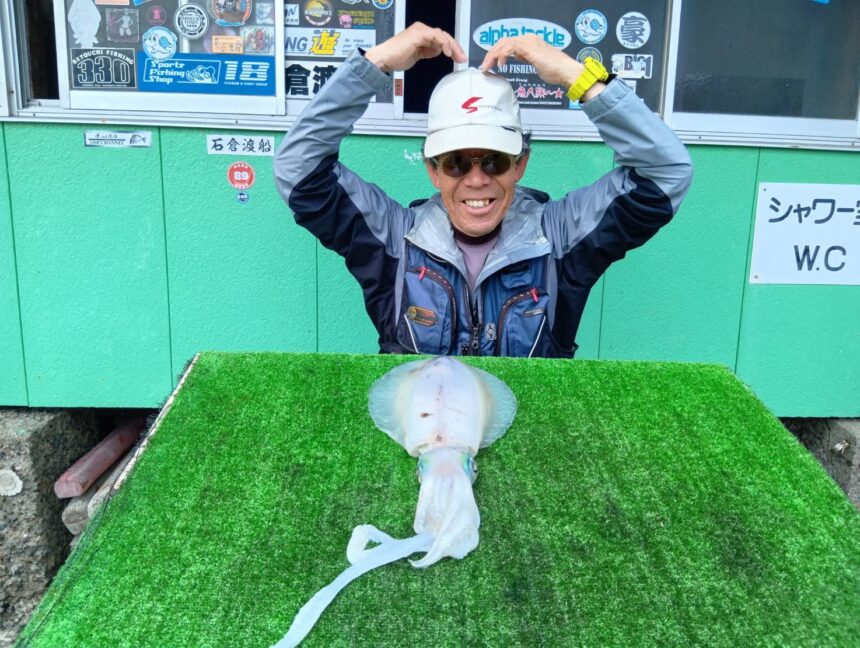 手漕ぎボートで野々山さんがアオリイカ1.36キロをゲット。