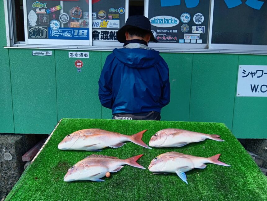 船外機ボートで三宅さんがマダイ65㎝、オオモンハタ、イサキ、ツバスをゲット。