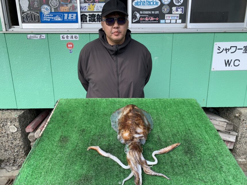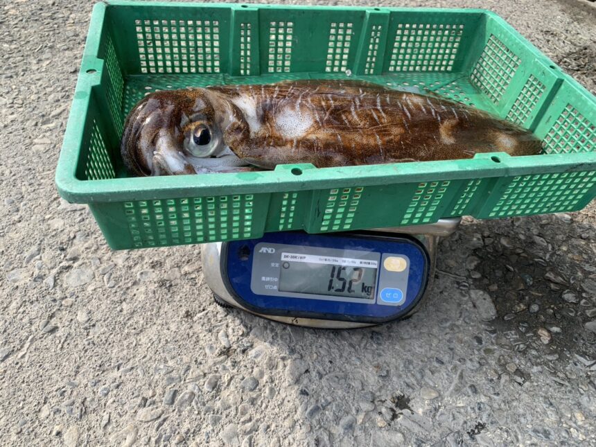 カセ釣りで藤本さんがアオリイカ1.52キロをゲット。