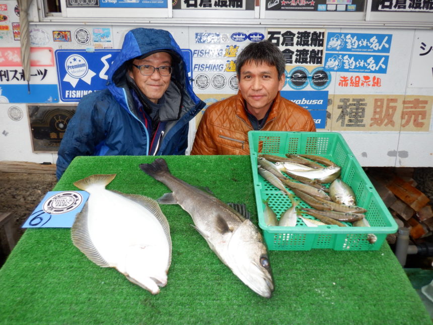 船外機ボートで安藤さんがヒラメ50cm、スズキ、アジをゲット。
