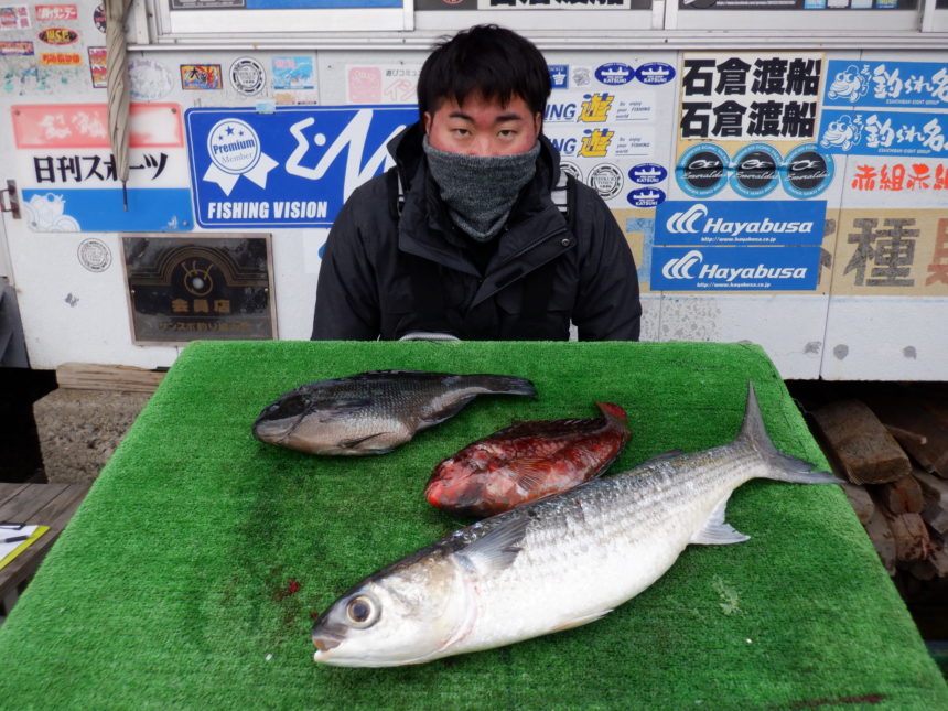 磯釣りで山下さんがグレ38cmとイガミ、ボラをゲット。