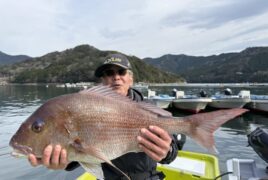 船外機ボートで平石さんがマダイ70㎝をゲット。