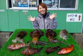 船外機ボートで西口さんがアオリイカ、スミイカ、カサゴ、アカハタをゲット。
