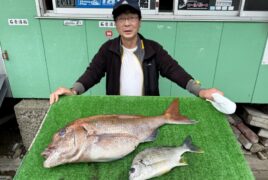 船外機ボートで太田さんがマダイ49cm、メイチ、オオモンハタをゲット。