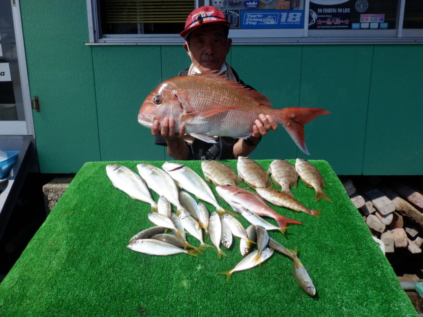 船外機ボートで佐野さんがマダイ67cmまでとツバス、メイチ、アジをゲット。